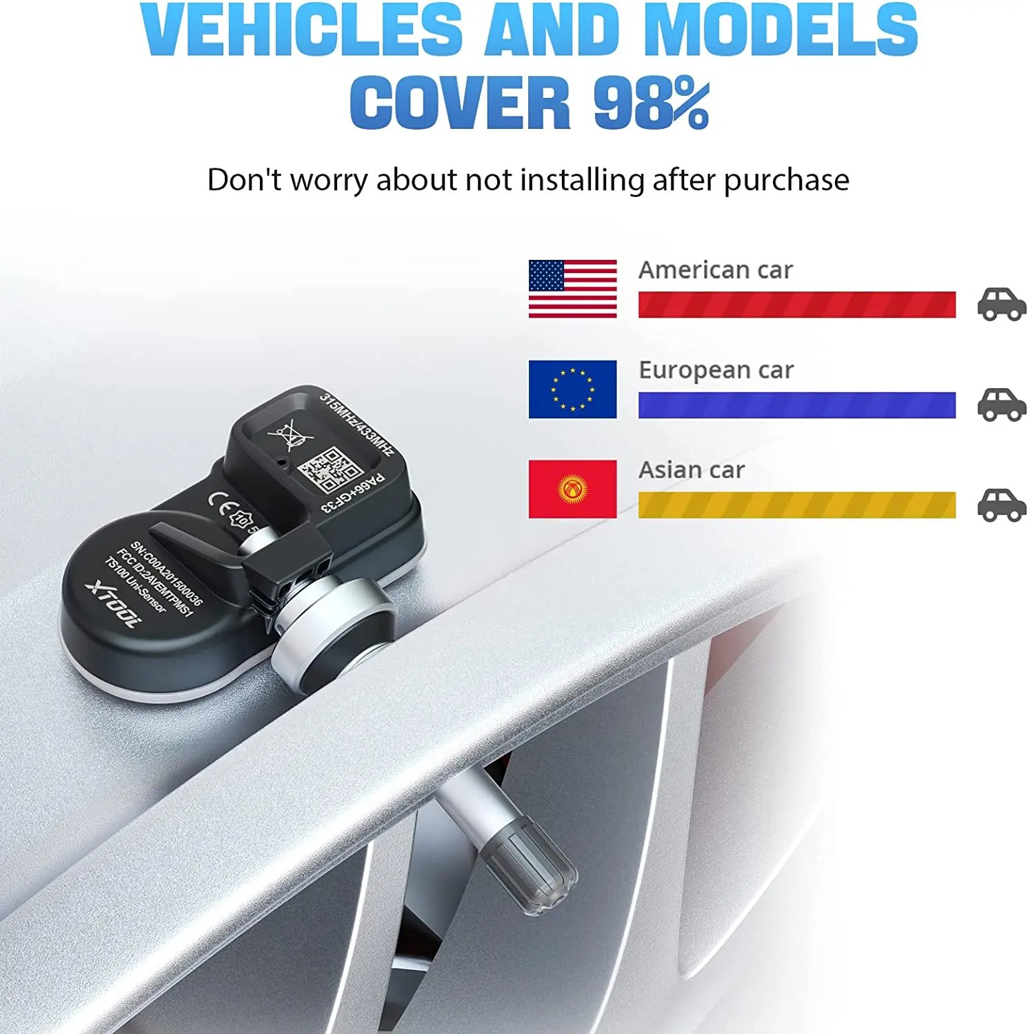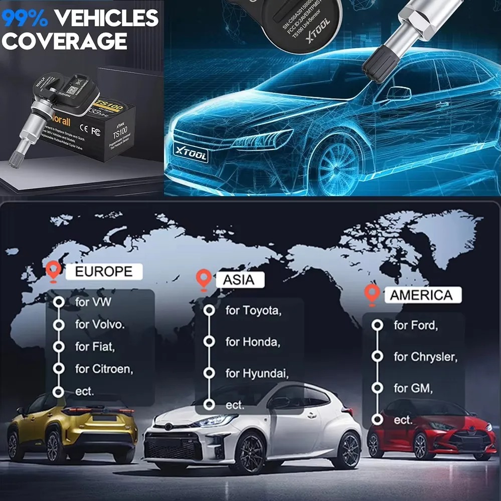 - Cảm biến TS100 PRO cần được lập trình bằng công cụ của XTOOL (TP150 hoặc IP819TP), hãy kiểm tra mẫu xe và năm sản xuất cụ thể để đảm bảo phù hợp trước khi lắp đặt.