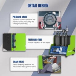 - Công nghệ tiên tiến: Thiết bị được trang bị màn hình LED, đồng hồ đo áp suất, ống thủy tinh, chất lỏng thử nghiệm thước đo mức và bảng điều khiển đa chức năng, có thể vận hành dễ dàng thông qua menu và giám sát việc test kim phun, lượng phun nhiên liệu trong thời gian thực.